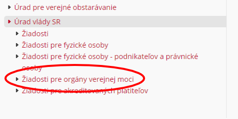 - Zobrazia sa žiadosti podľa oblastí. Vyberte „ŽIADOSTI PRE ORGÁNY VEREJNEJ MOCI“